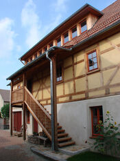 Das Fachwerkhaus wurde durch uns als Familie mit Hilfe unseres Architekten, vieler Handwerker und Freunde mit viel Enthusiasmus auf die ca. 800 Jahre alte Grundmauer in Anlehnung an historische Fotos wiedererrichtet. Die ausschließliche Verwendung baubiologisch unbedenklicher Baustoffe wie Lehm, Holz, Leinöl und Kalk ermöglichen ein gesundes Wohnen. So sind alle Wände mit Lehmputz versehen und der Fußboden besteht aus geölten Roteichendielen bzw. Terrakotta. Das Grundstück befindet sich im Dorfzentum an an einer ruhigen Nebenstraße, direkt am Ableger des Elberadweges nach Oberau. Ein Bäcker und ein kleines Lebensmittelgeschäft sind 1 Gehminute entfernt. Die Bushaltestellen nach Meißen bzw. Weinböhla sind 2 Gehminuten entfernt. Bis Meißen sind es nur 3 km - Fachwerkhaus Schwitzky