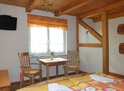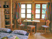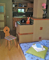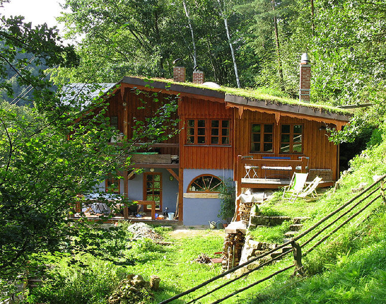 Gesunde Erholung in und mit der Natur: Oft schon habe ich in verschiedenen Urlaubsquartieren festgestellt, dass ich mich in unserem eigenen Heim wohler fühle. Besonders wenn meine geschulte Wahrnehmung so nach und nach die gesundheitsrelevanten Mängel der Herberge aufspürt. Trotz des Umgebungswechsels gelang es mir dann schwer, mich zu entspannen, worunter der erhoffte Erholungseffekt litt. Aus der Ferne sehnte ich mich nach der Behaglichkeit des selbst sanierten Fachwerkhauses in der idyllischen Landschaft des Elbsandsteingebirges. So reifte der Gedanke, wenigstens für Gäste mit unserer Erfahrung ein rundherum gesundes Quartier zu schaffen. Dabei legten wir großen Wert auf baubiologische Materialien (sichtbares Fachwerk, Vollholztüren, Lehminnenputz, Holzdielung, Cotto), eine gute Einpassung in den vorhandenen Naturraum sowie auf energetische Ausrichtung. Fuchsbau